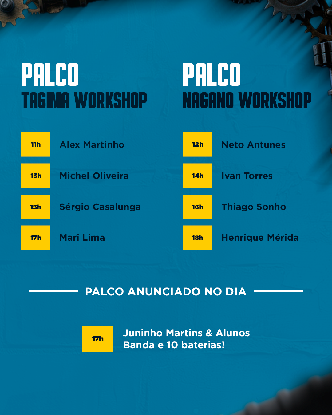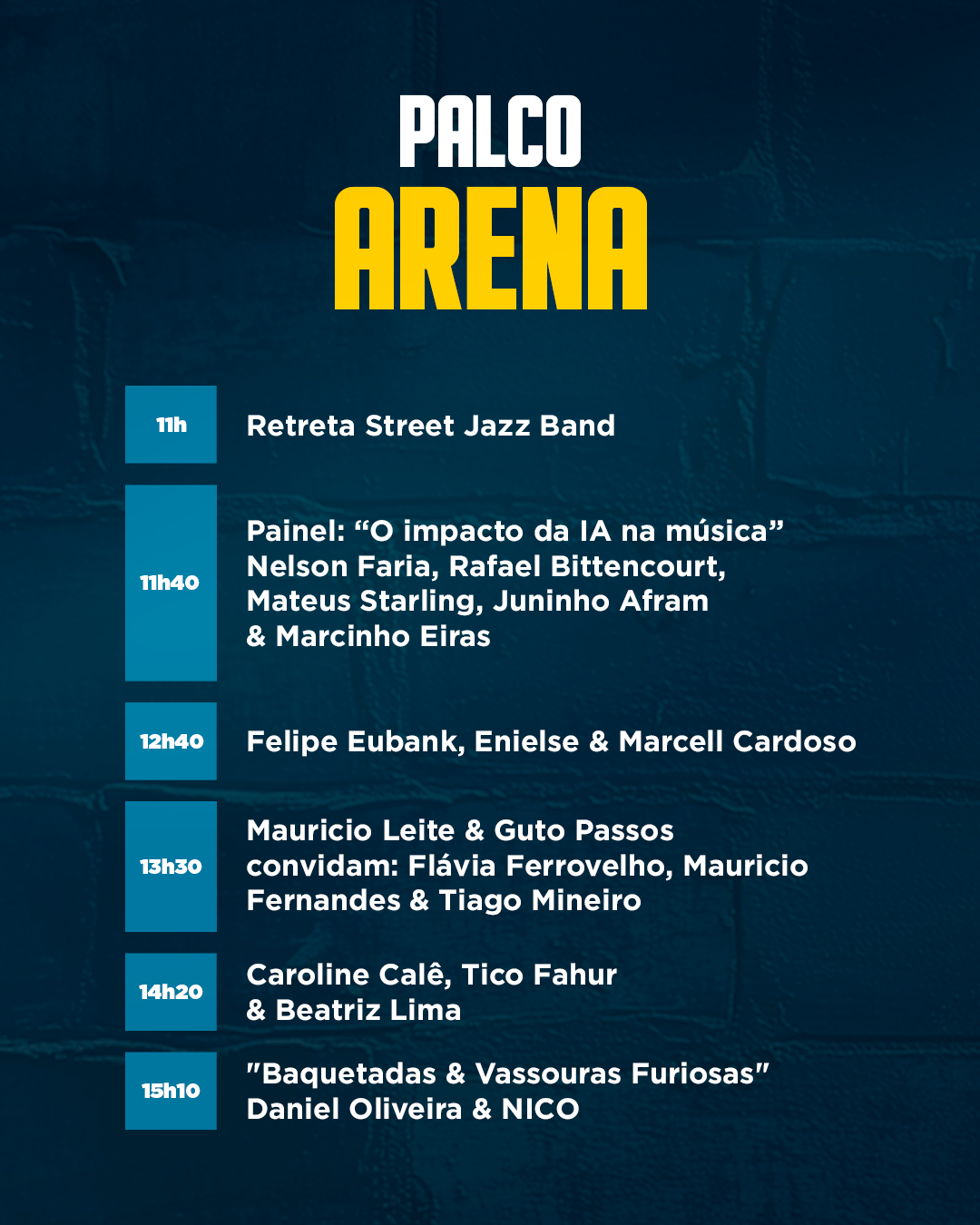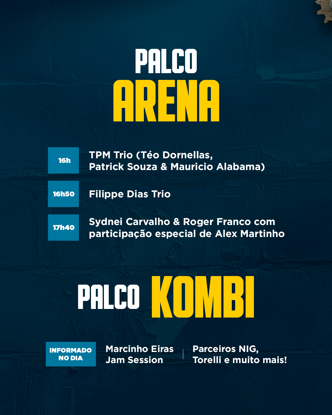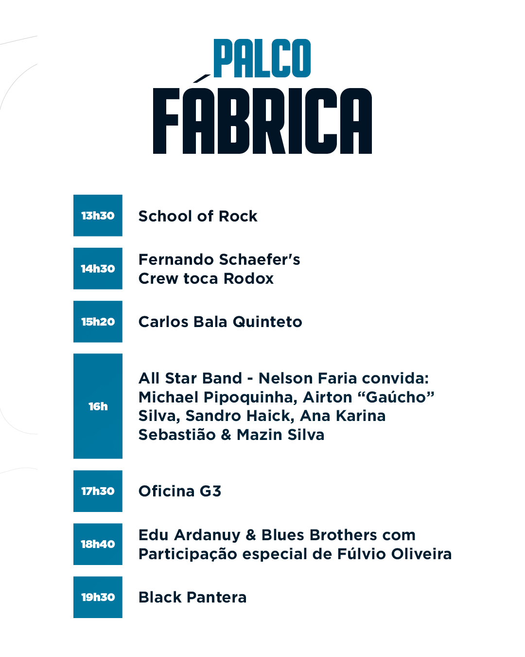 ALABAMA • AIRTON GAÚCHO • ANA KARINA • ARTHURZINHO LEAL • BEATRIZ LIMA • CACAU SANTOS • CARLOS BALA • CAROLINE CALÊ DANIEL OLIVEIRA • DANIEL REZENDE EDU ARDANUY • ENIELE • ESTILOSO BATERA • FELIPE EUBANK • FERNANDO SCHAEFER